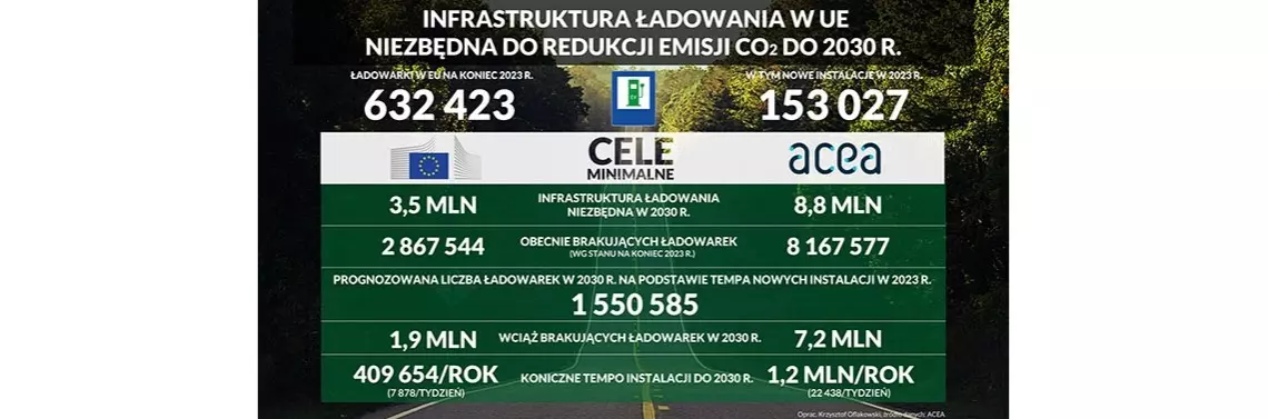 Z majowych danych Europejskiego Stowarzyszenia Producentów Samochodów (ACEA) wynika, że na koniec 2023 r. zaledwie trzy kraje Unii (Holandia, Francja i Niemcy) posiadały na swoim terytorium 61% publicznych punktów ładowania samochodów elektrycznych. To łącznie 384 333 ładowarek, spośród 632 423 dostępnych w całej Unii, z czego mała Holandia miała ich 52 razy więcej niż np. Rumunia, w której znajdowały 2 754 wtyczki. W Polsce ładowarek było 6 102, co stanowi zaledwie 1% europejskiej sieci.